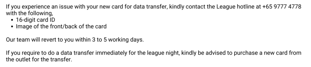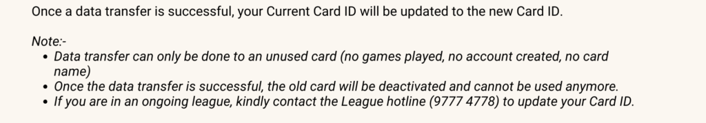 – If you are in an ongoing league, kindly contact the League hotline (9777 4778) to update your Card ID.