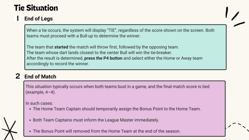 In all games, players must throw all three darts in hand, unless otherwise stated (e.g., X01 Freeze or Team Cricket).